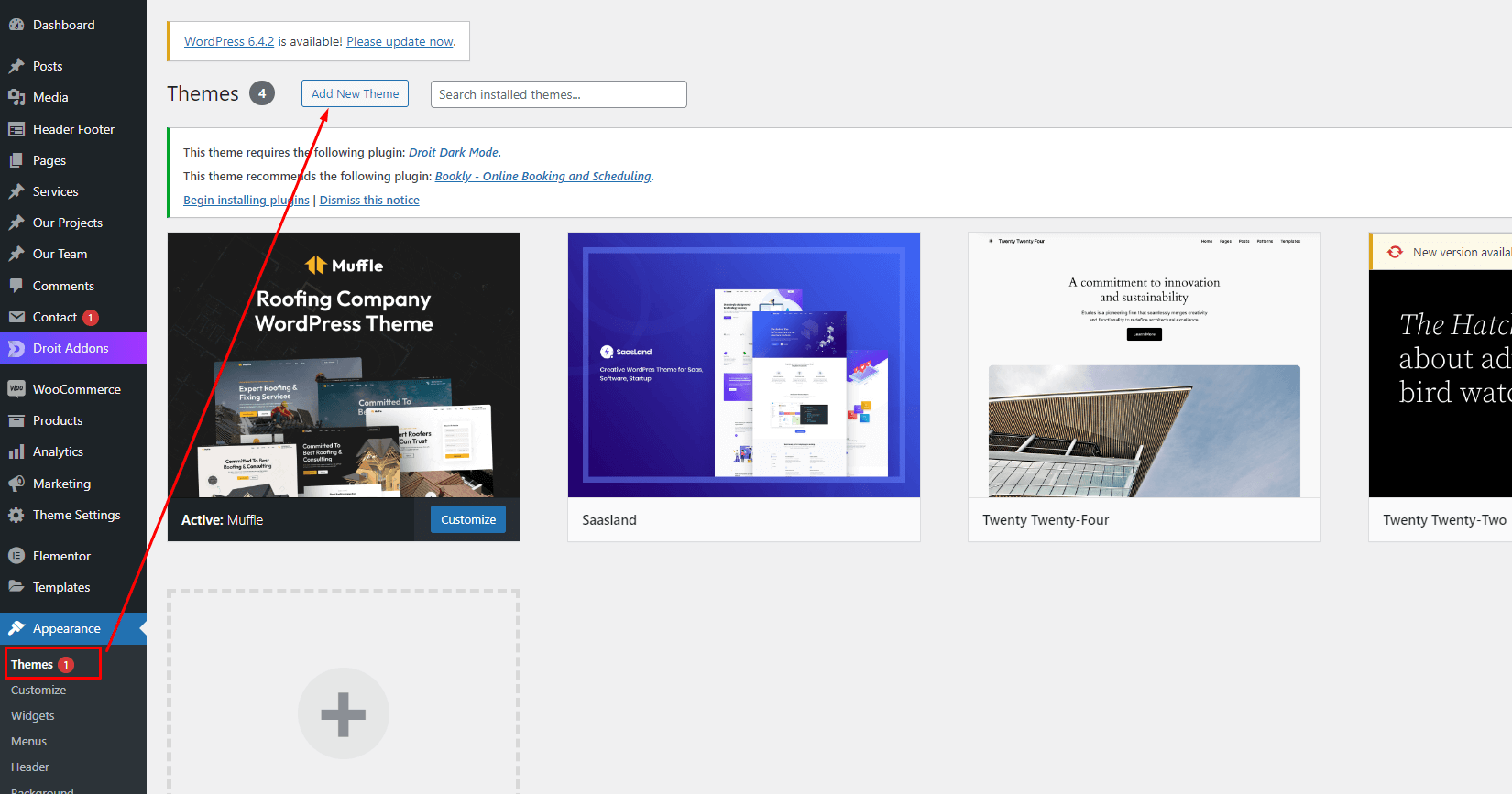 Now go to your site Dashboard > Appearance > Themes and click on Add New Theme like below